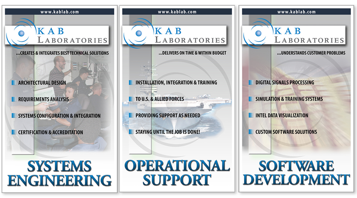 CONFERENCE BANNERS • A Series of 3 Banners Promoting Areas-of-Service Offered by KAB Labs — PRINTED ON 3'x6' VINYL & DISPLAYED ON STANDS
