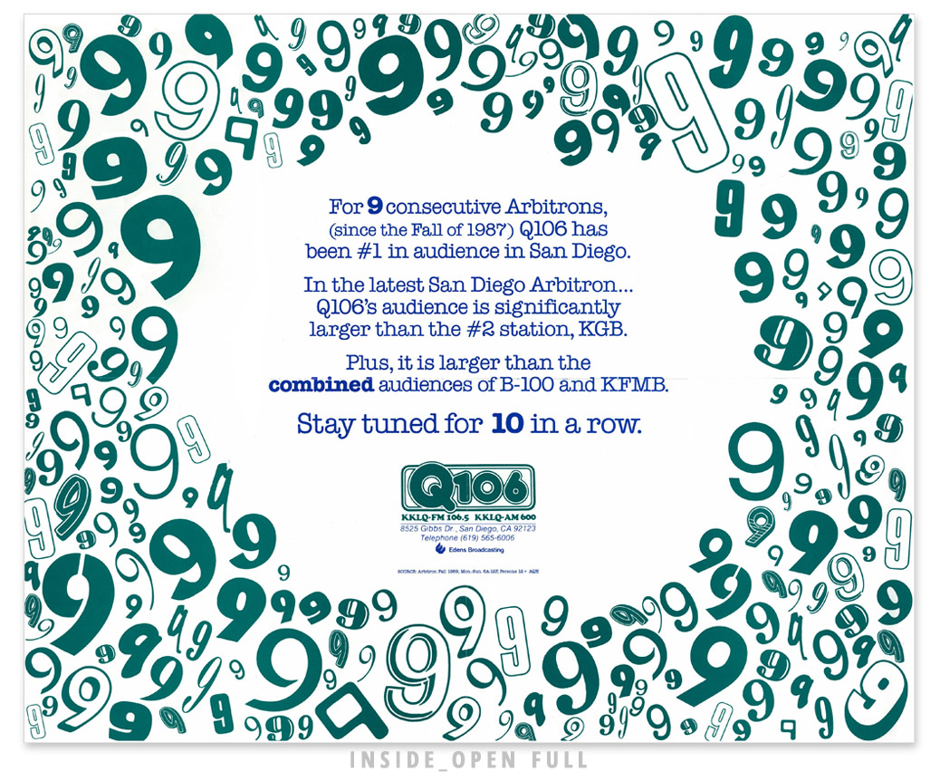 PROMOTIONAL MAILER • Two-sided Mailer, Announcing "Q106 Radio Station's 9th Consecutive Year at #1 " — PRINTED ON 18"x22" COATED PAPER